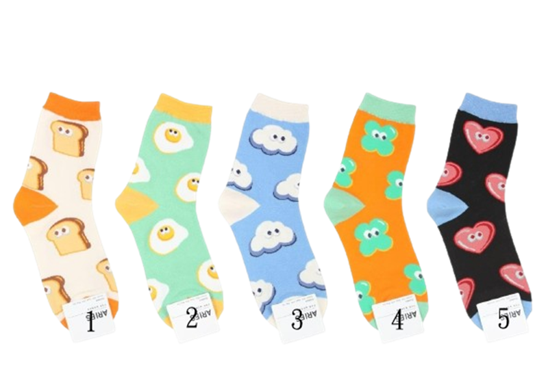 現貨韓國襪 滿版小卡通束口中筒襪 文青襪A組 吐司煎蛋雲朵四葉草愛心襪中筒襪塗鴉襪撞色襪socks