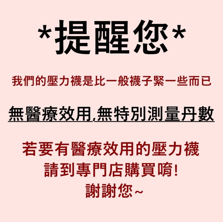 剛好的壓力貼緊腿部,為一天累積的壓力完美釋放保護支撐小腿的最佳物品漸進式加壓 讓腿部得到放鬆可以疊穿絲襪或緊身褲,不會顯得臃腫適合久坐與久站者【 注意事項】▶ 為保障消費者的權益,襪品屬於貼身衣物,商品一經拆封,恕無法退換貨。 ( 如遇到瑕疵請使用聊聊與客服人員洽詢 )▶ 商品因手工測量,或有1-2cm誤差,屬正常情況▶ 產品顏色可能會因拍攝與螢幕色差而有些許差異,請以所收到之實品為準。▶ 下單視為同意上述之賣場規範。